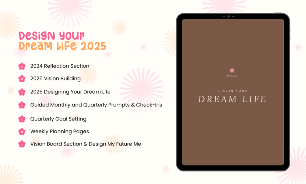 Ready to create a life you love in 2025? The Design Your Dream Life Planner isn’t just a tool—it’s your personal guide to turning dreams into reality. With thoughtful prompts, actionable steps, and space to reflect, this planner helps you stay aligned, focused, and inspired every step of the way.
