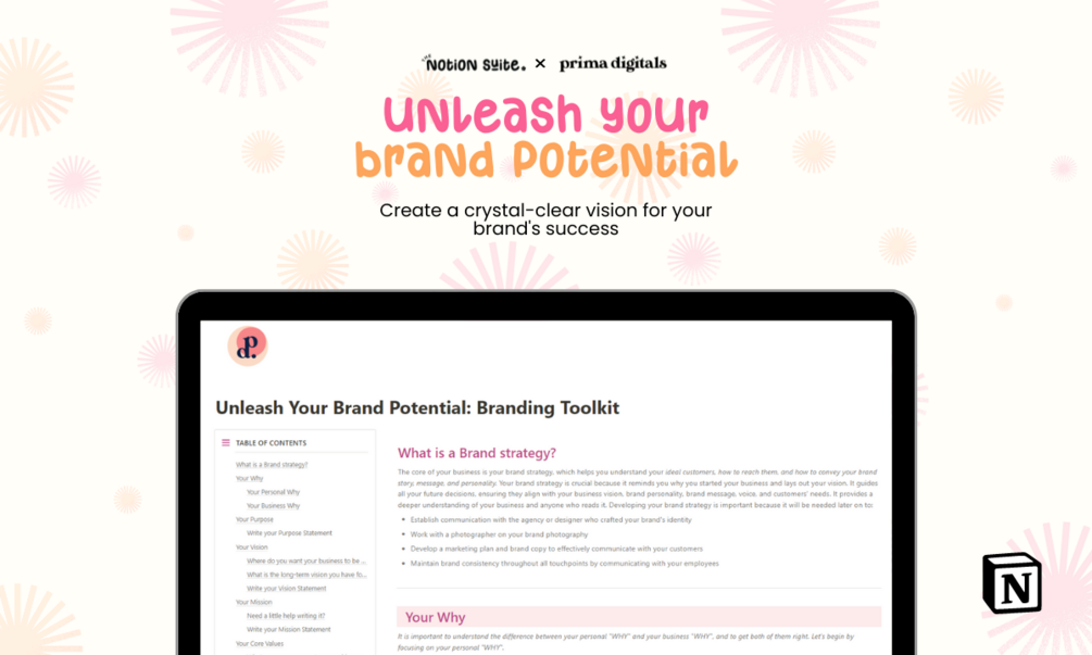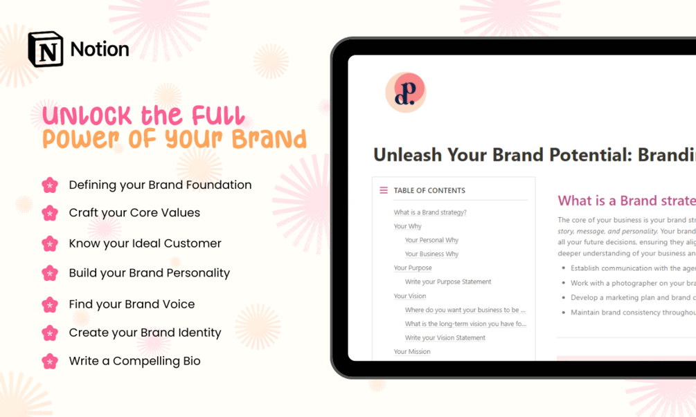 Empower yourself to take charge of your brand's growth with our Notion Branding Template Kit. Start Building Your Brands. Touching the Hearts of your audience.