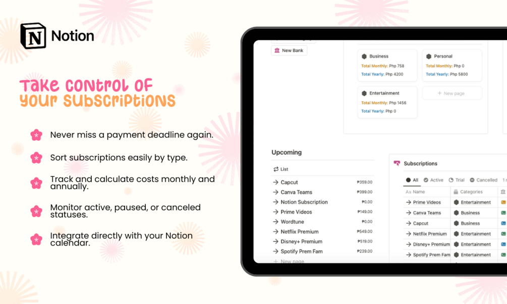 Managing multiple subscriptions can be overwhelming, but not with our Notion Subscription Tracker! Designed to simplify your subscription management, this template is perfect for personal, business, or entertainment uses.